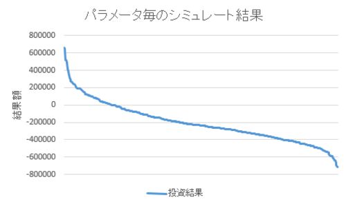 初期値鋭敏性により最初に設定したパラメータ次第で結果が全く異なるため、過去一年分に対して様々なパラメータ設定をしたシミュレート結果をグラフ化してみた。 パラメータ次第では最高パフォーマンス +60%, 最低パフォーマンス -70% といったところ。 しか…